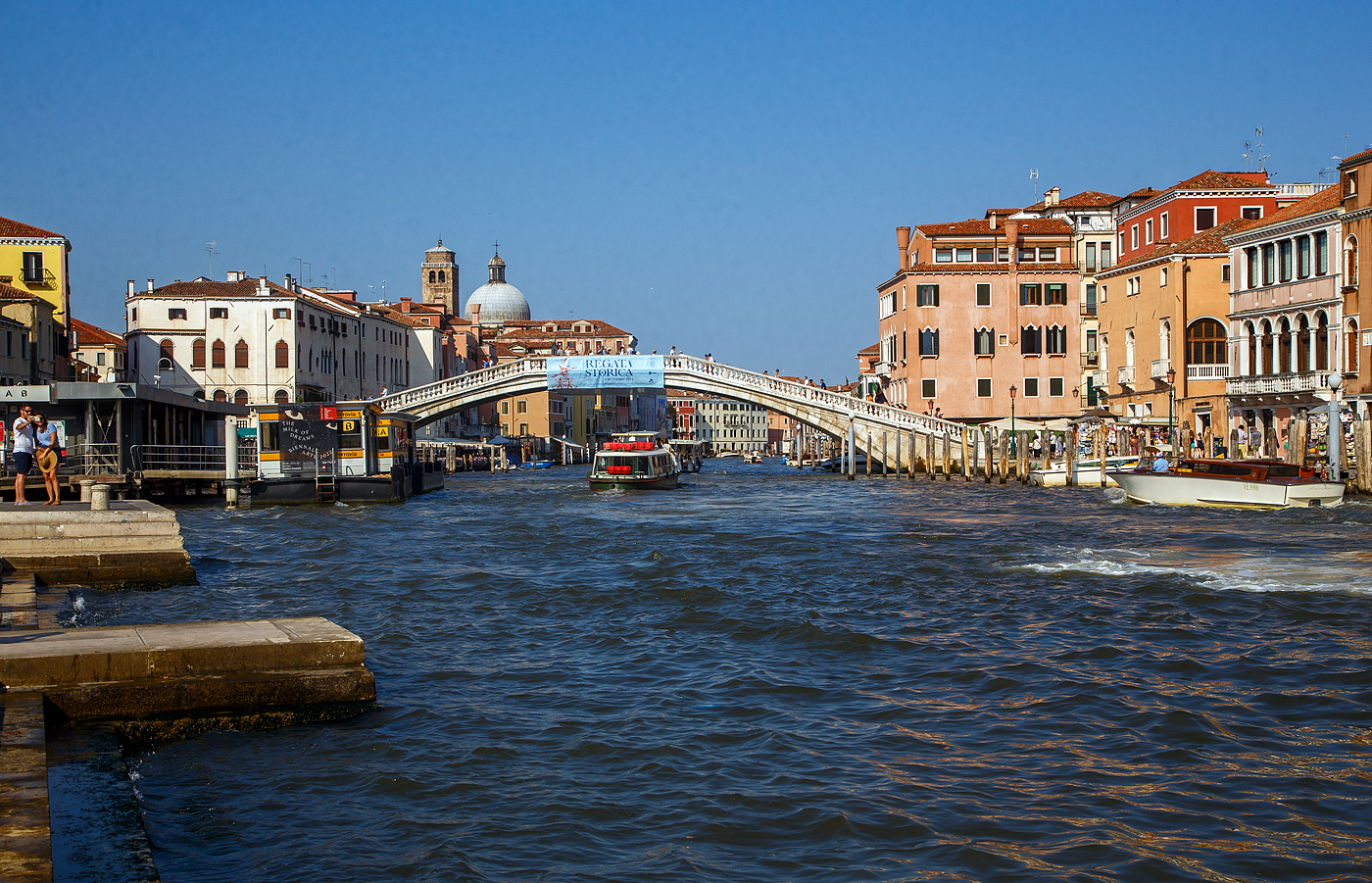 Blick über den Canal Grande auf diesen überspannenden Scalzi-Brücke (Ponte degli Scalzi) in Venedig am 24.07.2022. Benannt ist die Brücke nach der naheliegenden Scalzi-Kirche (Santa Maria di Nazareth, umgangssprachlich Scalzi), hier links im Bild. Die Scalzi ist eine der am meisten begangenen Brücken Venedigs. (zum Bild)