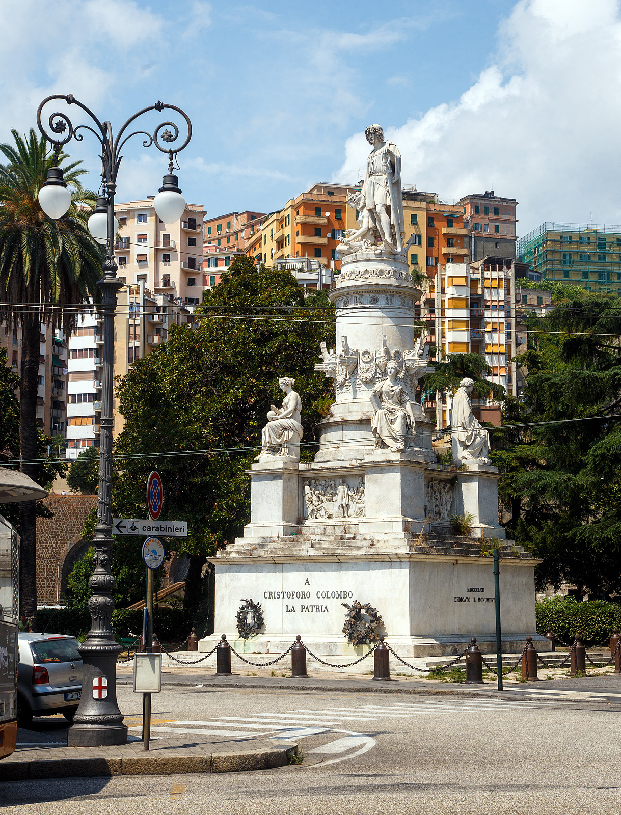 Das Kolumbus-Denkmal auf der Piazza Acquaverde (beim Bahnhof Genova Piazza Principe) in Genua der Hauptstadt der Region Ligurien, am 23 Juli 2022. Der Seefahrer und Amerikaentdecker Christoph Kolumbus (italienisch Cristoforo Colombo, spanisch Cristóbal Colón, portugiesisch Cristóvão Colombo) wurde um 1451 in Genua geboren und gehört so zu den berühmtesten in Genua geborenen Söhnen. Im Wettlauf mit Portugal um den Seeweg nach Indien im Rahmen des Indienhandels wollte Kolumbus den Weg im Westen erschließen. Bei der Entdeckung Amerikas 1492 stand Kolumbus in den Diensten des Königreich Kastilien (heute Spanien). (zum Bild)