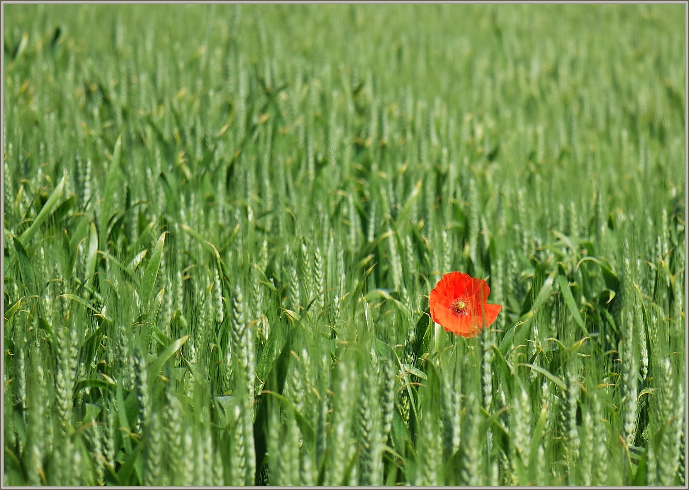 Für einen roten Farbtupfer sorgt diese Mohnblume im Weizenfeld. (31.05.2023) (zum Bild)
