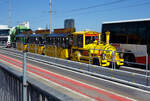 der kleine Zug inmitten grosser LKW! Wie gut ist er durch seine gelbe Farbe gut zu sehen.